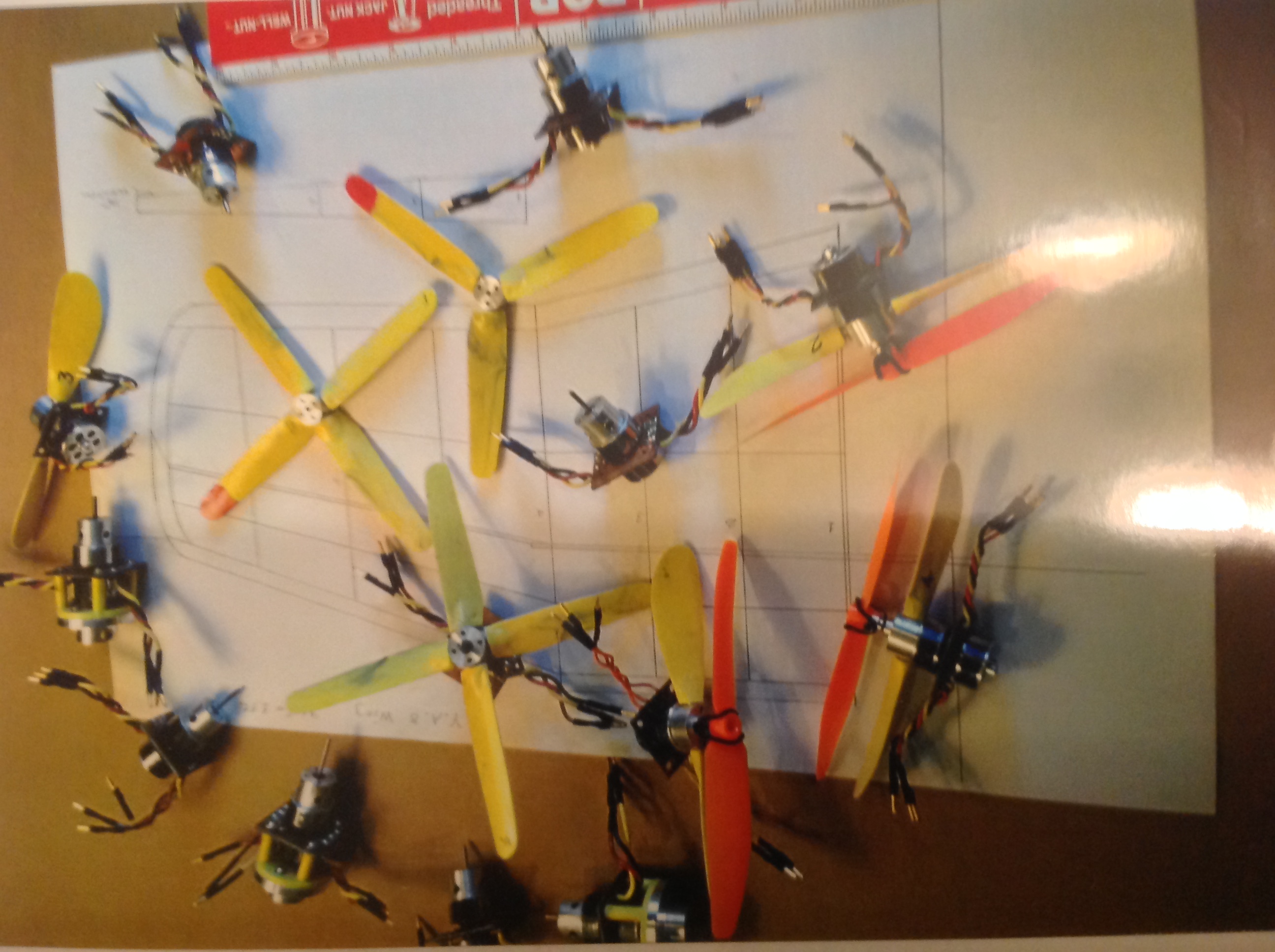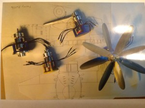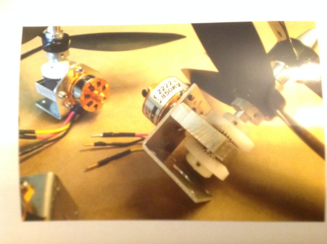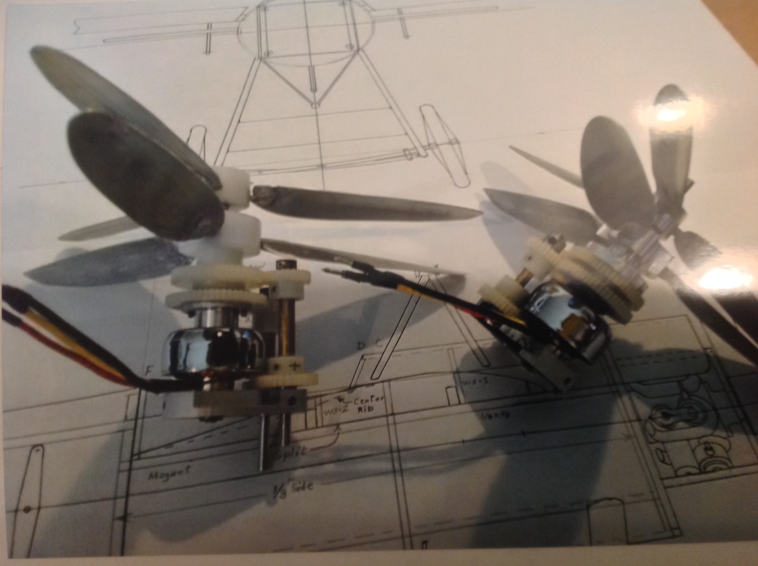 Moving onto motors, to save weight he tried to drive two propellers with one motor this would therefore only require one Electronic speed controller and the battery size could be reduced, the new gearing did not save much weight plus the complete assembly was very bulky however these did work. The next step was to try different centre drive shafts 2 and 3mm in diameter as ball races for this size were readily available, also at this time the RC drone came to the world market making a multitude of various inexpensive parts available including a very large range of propellers to suit his needs.