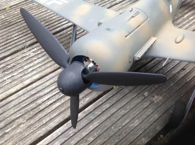 Original 3 blade propeller now fitted. This was made by GESCH SUPER 10×5 24×12 this prop was made for this model and is 54 years old. I did have the original spinner but this was lost many years ago, this is a small glass fibre one I have made.