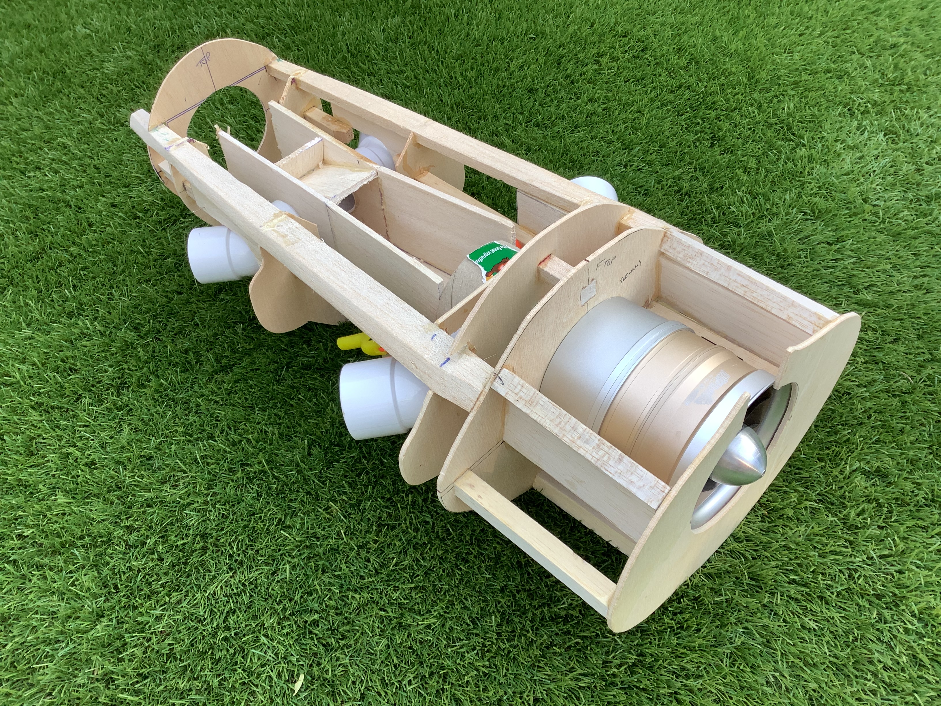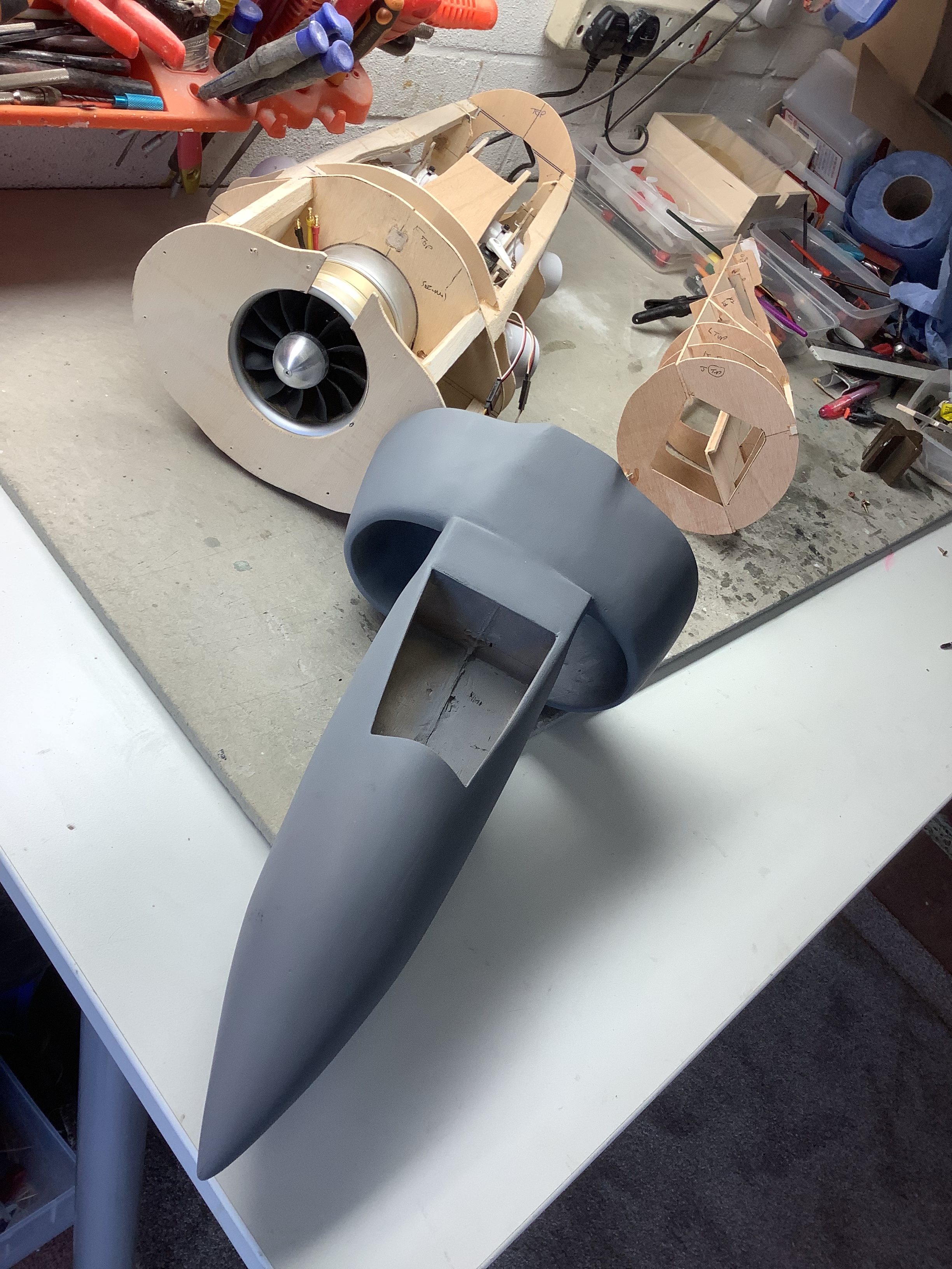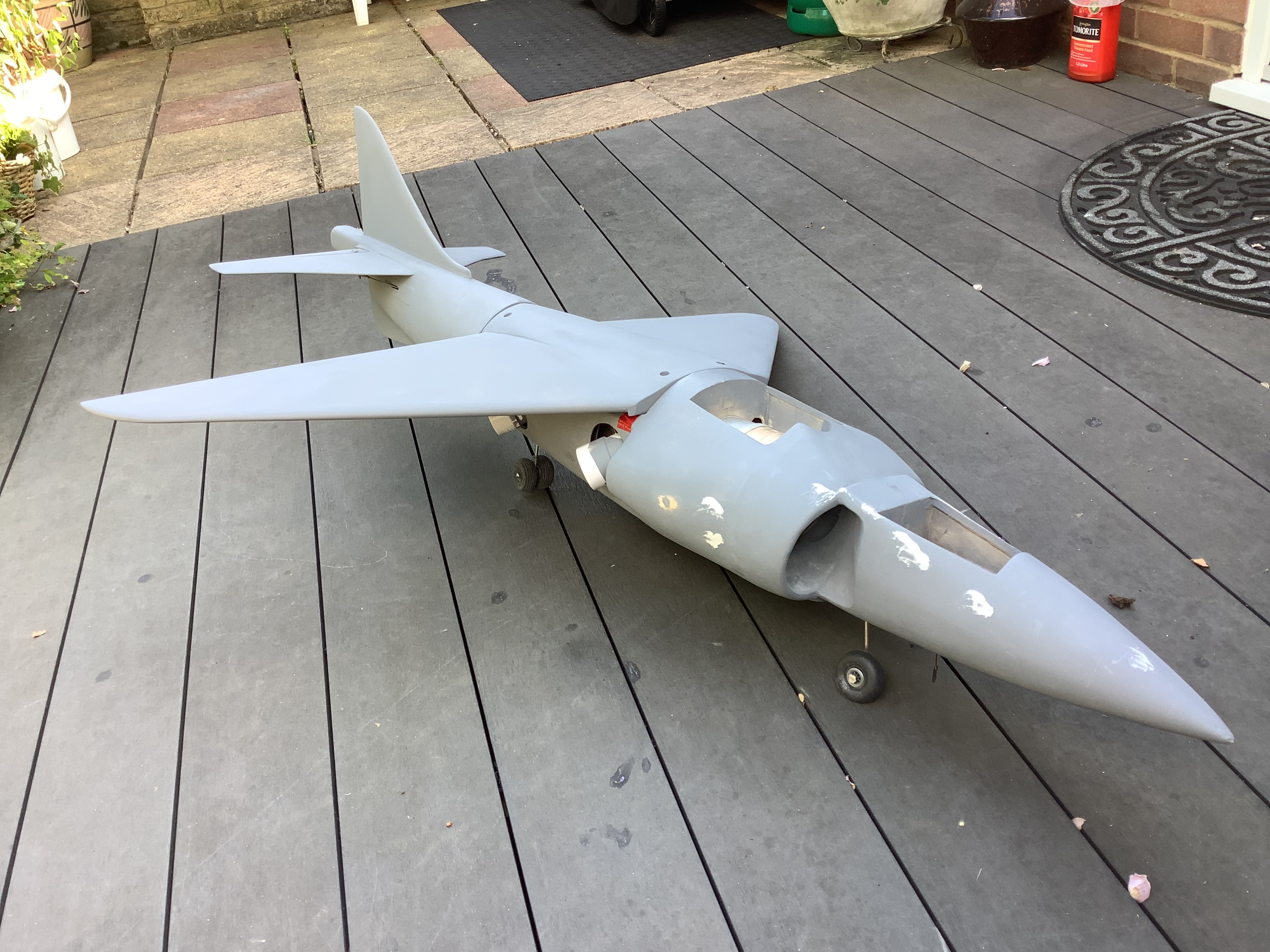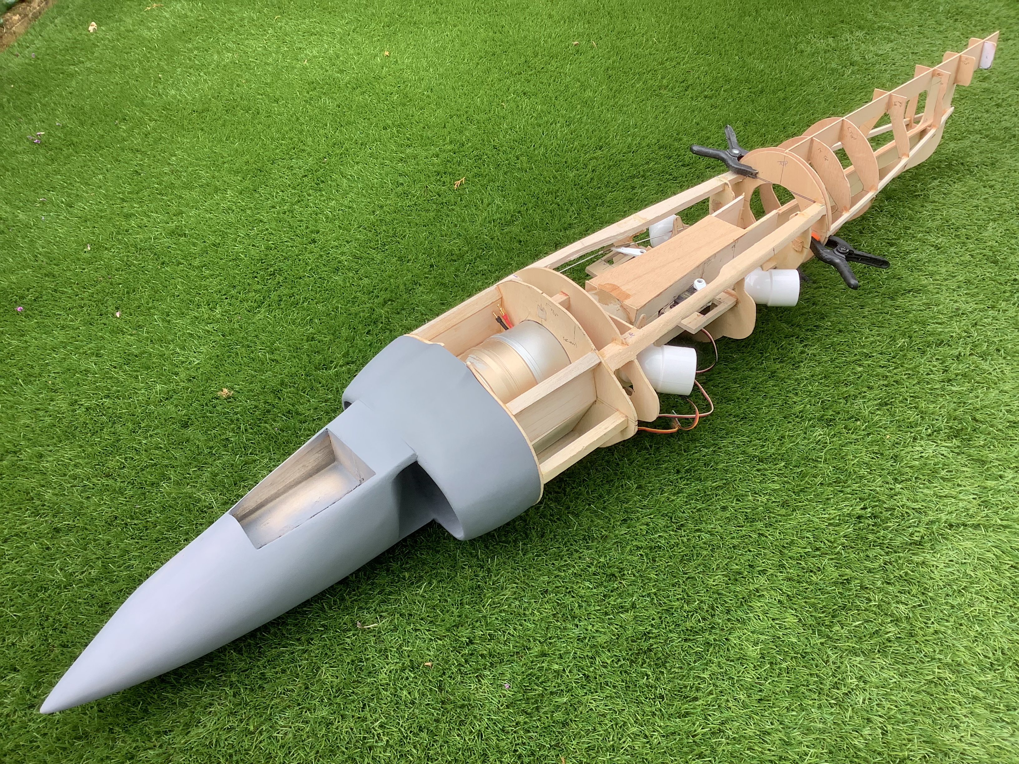 I have been looking at making this aircraft for a few years now, during lock down I decided to move this project forward doing research and looking at drawings of the jet assembly, I have now narrowed this design down to two options the first with four 50mm EDF fans or using a single 90mm fan rated at 2000 watts and running on a six cell Lipo, a mock-up of the jet assembly was made to prove the variability of the 90mm assembly this proved to work very well so work proceed on motor tests and the installation of the jet nozzles and control systems once this also worked I decided to move forward with the construction of the complete model photos show the various stages of construction and any details, the model is of balsa and lite ply construction and then covered in light weight glass fibre with resin.