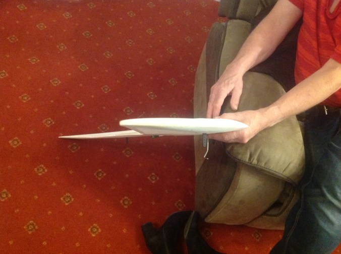 Maiden flight 24 March 19. Disastrous results two flights crashed both times un-flyable model flew straight up spun over and came straight down bang broken wing. Took model home repaired wing and reset line guide, reduced movement on elevators to + and – 4mm, re-calculated CG position added a load of lead in nose.