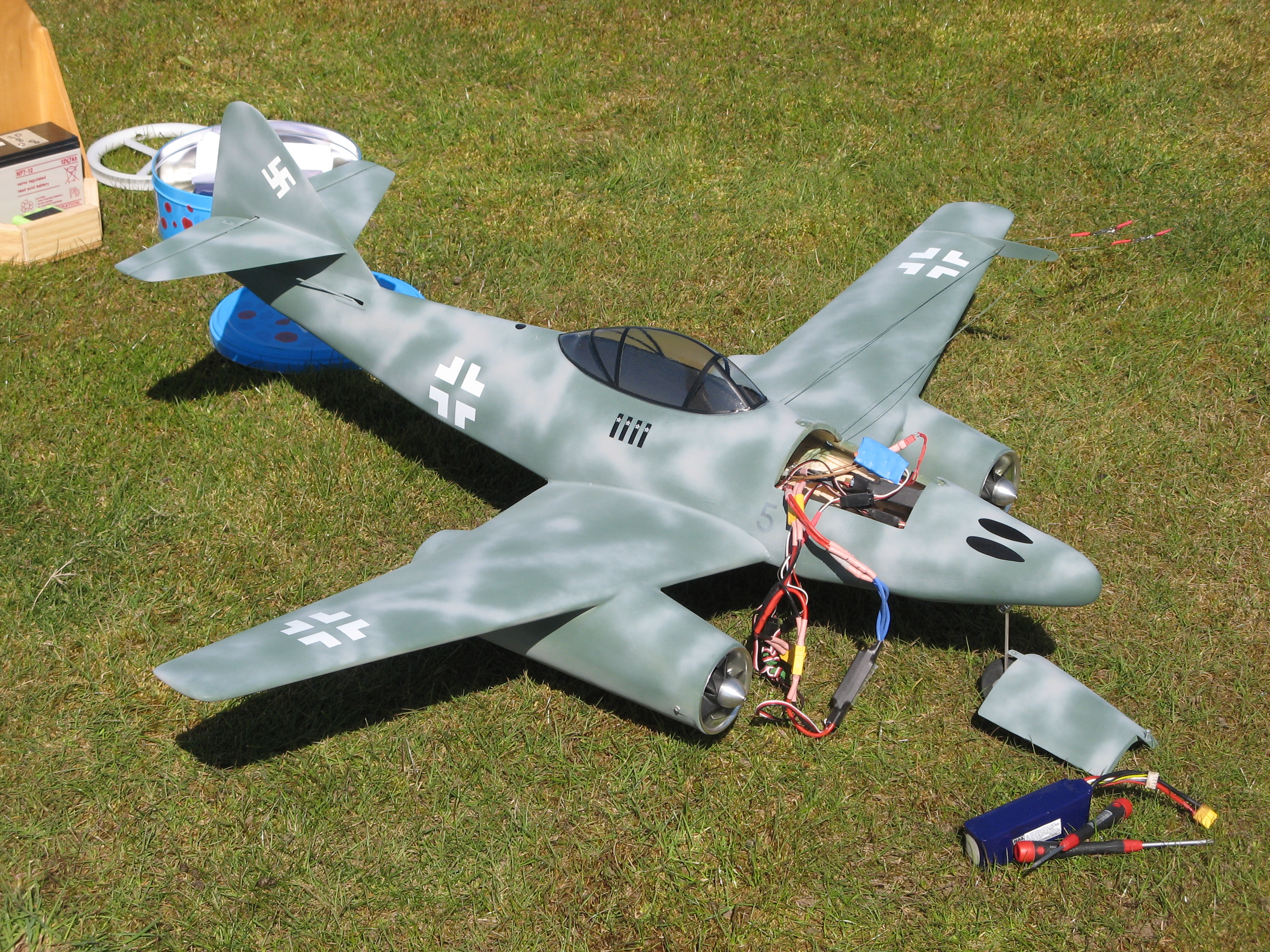2011. Messerschmitt Me 262 wing span 48 inch. It is now time to try and see if a twin EDF Fan model would have sufficient power to fly satisfactory. It was therefore decided to construct a Me 262 using two Lander 75 mm diameter Fans rated at 600 watts each, these would be powered from 14.1 volt Lipos running 60 amp speed controllers. Construction of the model proceeded well with no major problems the Fan units were fitted into cardboard tubes to save time, the model was also fitted with E-Flite retracts. The model was taken to a local grass playing field for the first test flights, to our amazement the model leap off the ground at great speed showing the benefit of metal Fans, the model also showed very good low and high speed flying characteristics, bearing in mind the all up flying weight of 2.3 Kg. This is broken down into model weight of 1.1Kg and all electronics including retracts 1.2Kg.