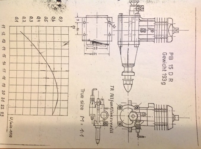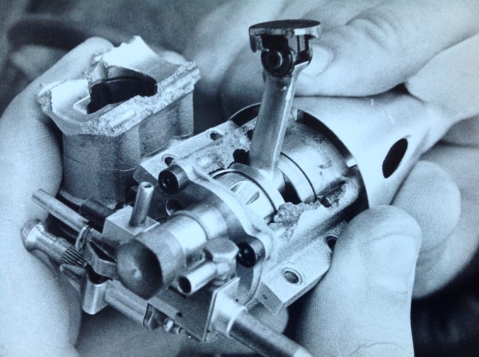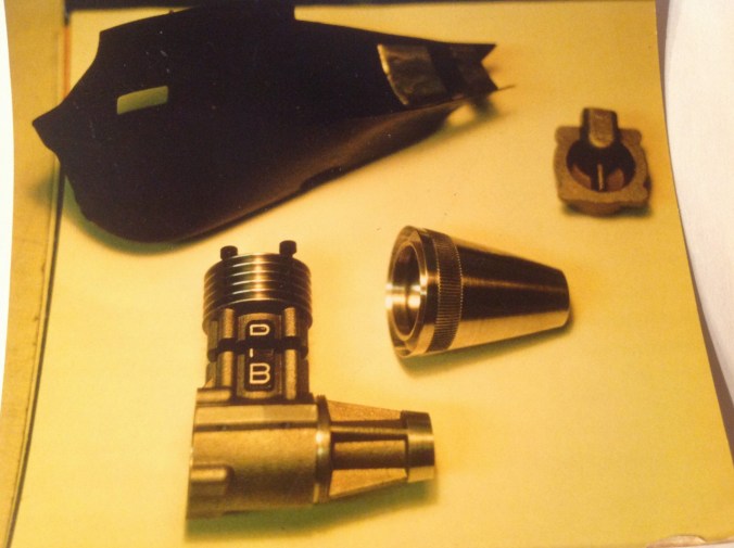 After this Paul seemed to disappear off the scene for a few years, I can vaguely remember him saying he had been to or working in East Germany at a motorbike factory helping with tuned pipes and carburettor design? I remember one night Paul discussing the optimum length of a carburettor nearly the length of the model. Paul also showed me his RC carburettor design, the carburettor had a slot cut from the top to the bottom on one side, a metal spacer the same shape was inserted with a hinge pin at the bottom, by moving this metal spacer in or out you could control the speed of the motor. Anyway the next stage was the Start of Bugl motors, many prototypes were made long and short shafts, with or without boost ports ending in the production models MK1, MK11, and finally the MK111 and “MOSKITO” parts including the retract model.