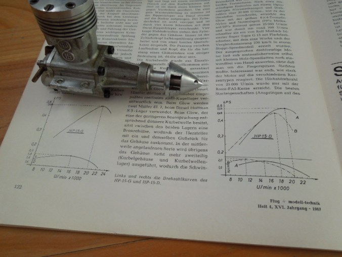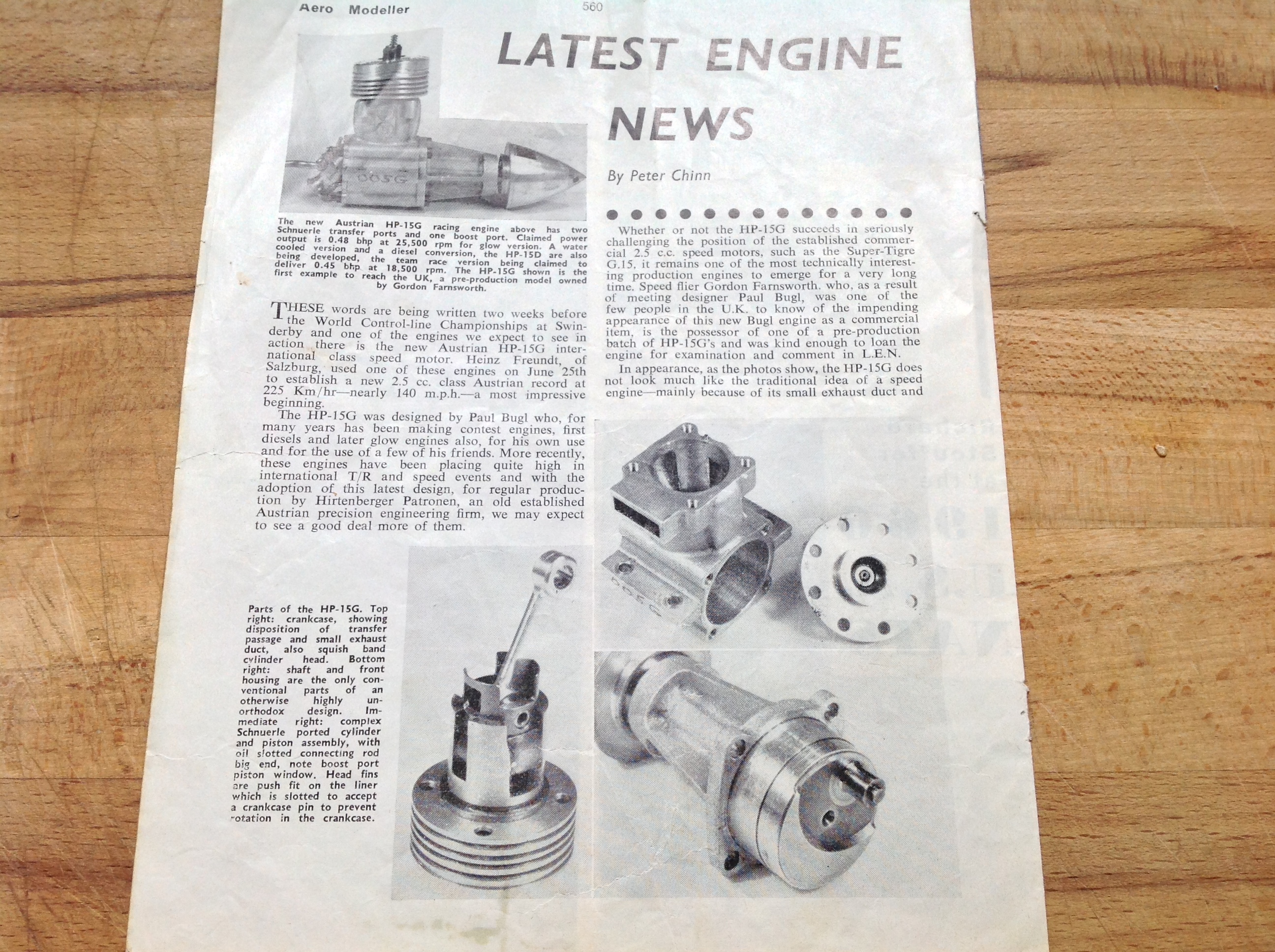We often discussed motor and model design, so far no mention has been made about his time at HP and his HP motors. Paul did discuss some of his time at HP and here are some of the facts I believe, I cannot confirm these but I think there is some element of truth in them. Paul was employed at HP to design and manufacture motors for large target aircraft for the military, at the same time he used these facilities to start-up production of the HP 15 and HP60 radio motors for commercial sale. This is where the story gets very confusing and not very clear, as I understand Paul went on holiday and while away the auditors carried out progress checks and found only limited sales for large investments i.e the grinding machine for the bell drums for example (thousands of DM). Paul never returned to HP. A limited number of HP 15 motors where completed for team race and a few speed motors. The team race motors preformed very well winning many major competitions, obviously Paul had a winning design with his HP15 which would make the basis of his next project Bugl motors. The only HP15 I have seen is owned by Hans Straniak this is new complete with cut-out and un-run in a clear plastic box very similar to the Cox 15 box. Another point of interest was Paul told me about the time they visited Pec’s for the Hungarian competition with their HP15’s I think they won, however when they came down from the hotel on the following morning to return home the cars had been broken into and all the motors and models stolen? The Russians were also at this event maybe this is another story?