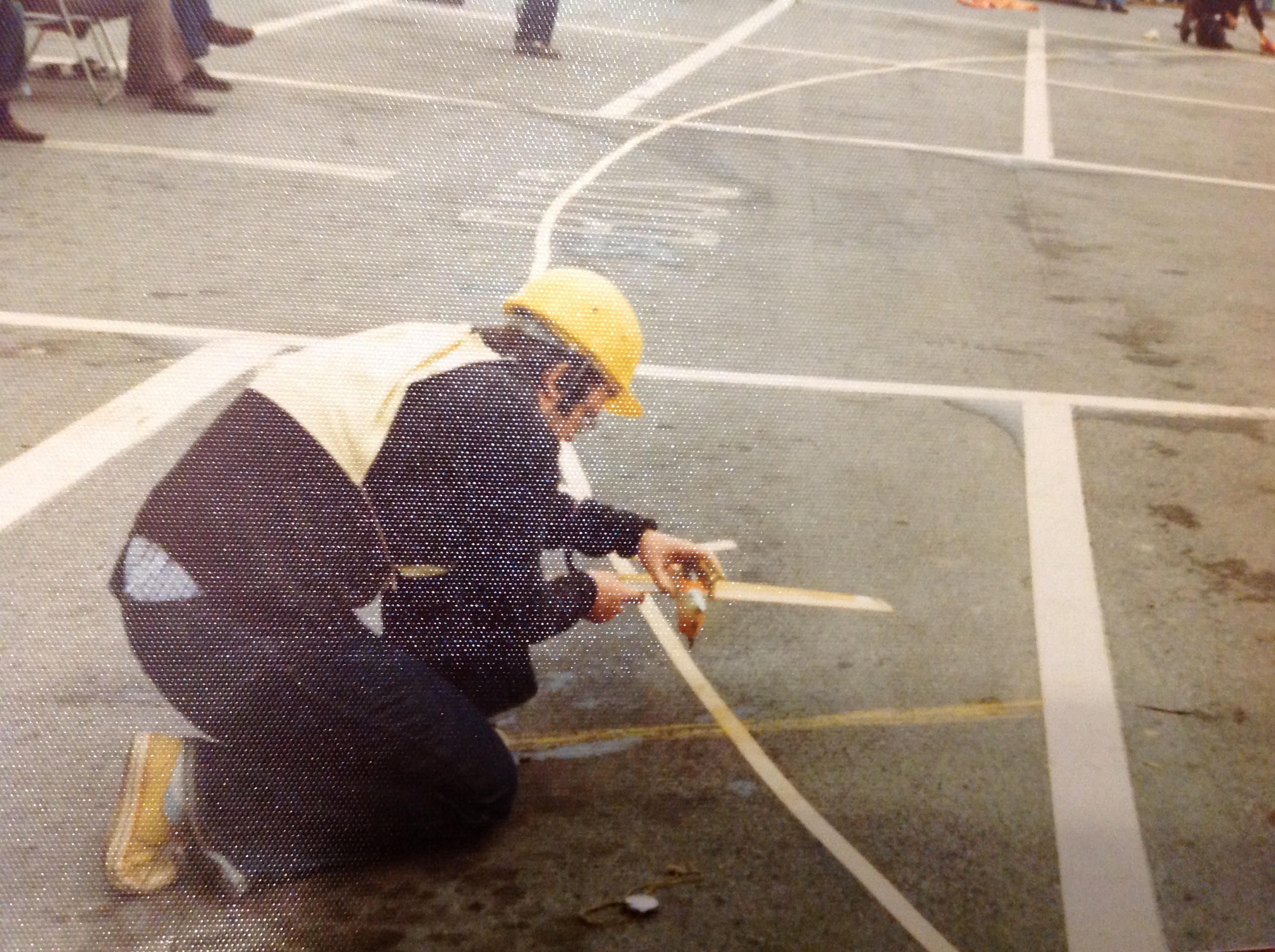 Baumgartner warming up his motor, note his thumb adjusting needle valve and stop watch on the ground.