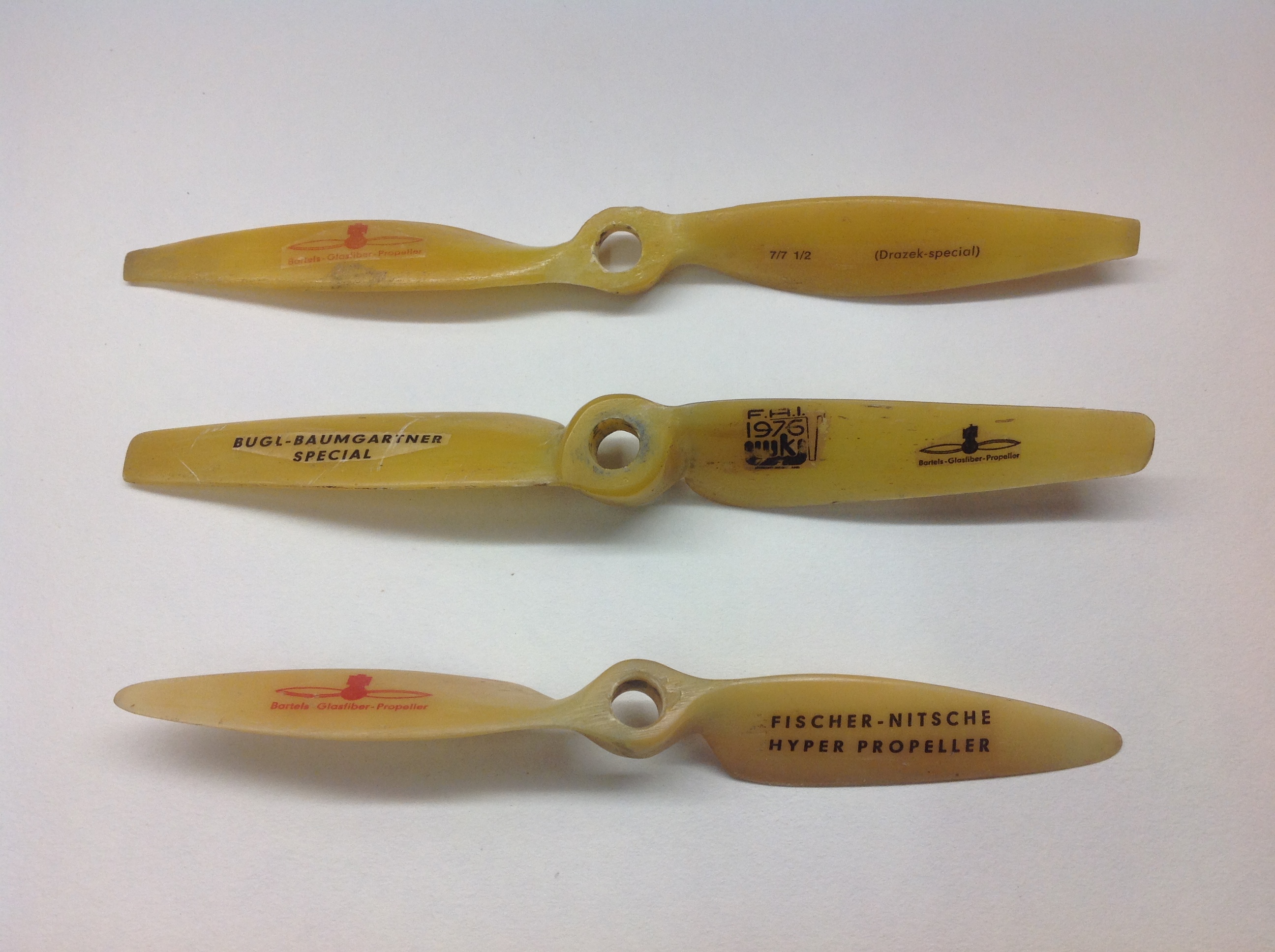 So there we have it Paul had a motor and model combination which worked very well in contradiction to all know conventional ideas in team race with many/many people questioning whether he was right or not. We continued to use his motors and models with good results ending up with the ultimate retract model however this was rather heavy, I did make normal balsa models without the metal crutch system for comparison but these showed no improvement over the original “MOSKITO” another factor which I did not realise was the number of flyers using Paul’s motor and models in Europe. There is one other person I must also mention this is Jurgen Bartels who made nearly all the fibre glass propellers used by these teams. These ranged from the classic Drazek-special 7×7 1/2 through to the BUGL-BAUMGARTNER and the FISCHER-NITSCHE propellers.