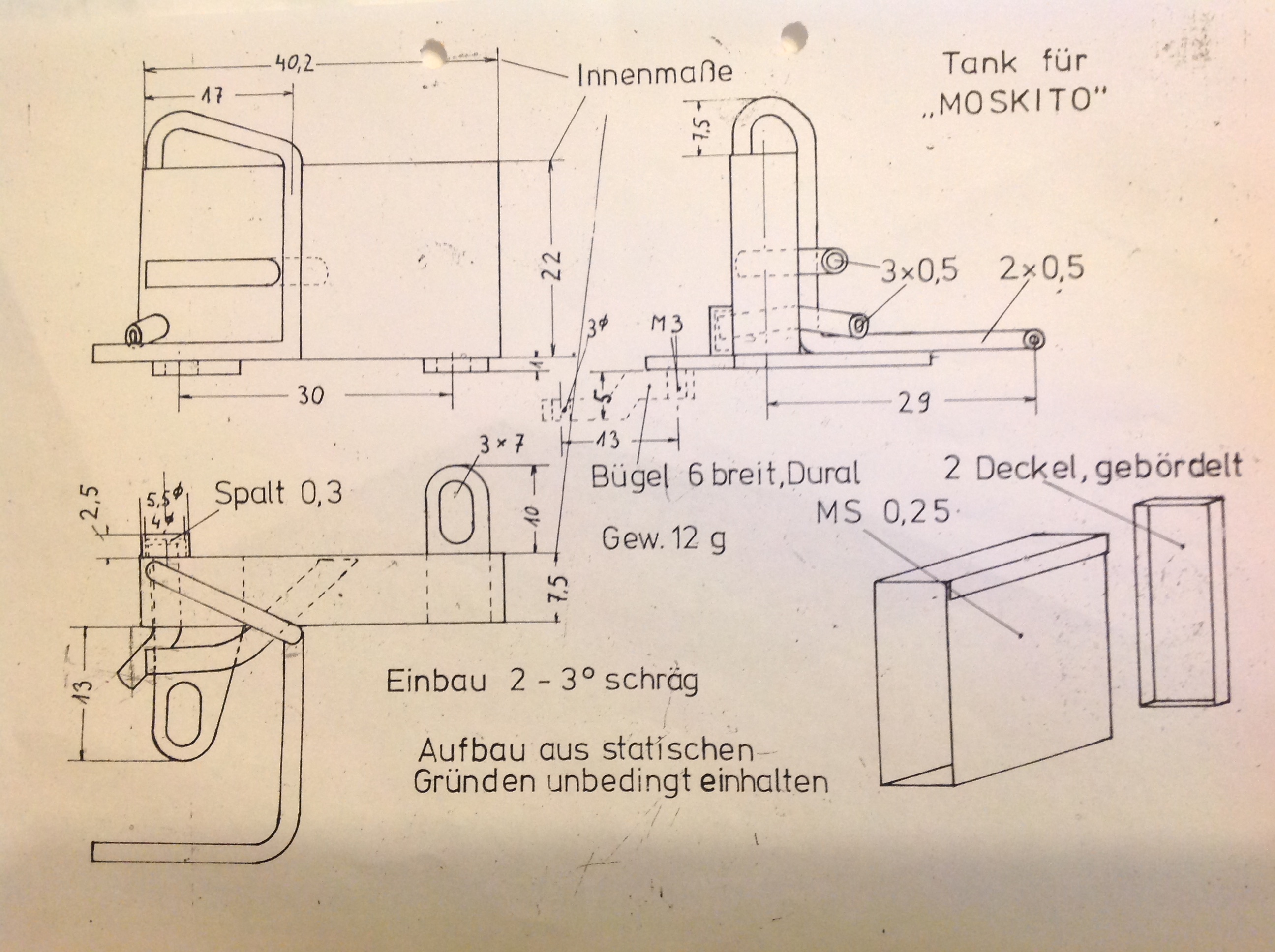 Paul was a perfectionist in his machine work I will never forget when teams were fitting cowling around the wheel to reduce drag, at the next competition Paul turned up with a fully machined metal one fitted to the leg, it was only just wider than the wheel we all just looked at amazement. Paul started design on his Bugl 40 and 60 RC motors but non were ever completed, strange if you look at the photo “Made in West Germany” how times have changed. Paul did keep a small black book which he recorded the motor serial numbers and to whom they were originally sold this also had RPM figures for each motor, one day when we was in the woods testing the wind blew open the page to Baumgartner ask no more. The MK11 motors had a coloured motif on the side of the motor and to the best of my knowledge the production motors were black, Austrian and friends red and any motors that were blue belonged to Paul this was his colour same as on the “MOSKITO” model even the propellers made for Paul by Bartels were blue. I will not go into technical details of these motors as these will be covered by Luis in his chapter.