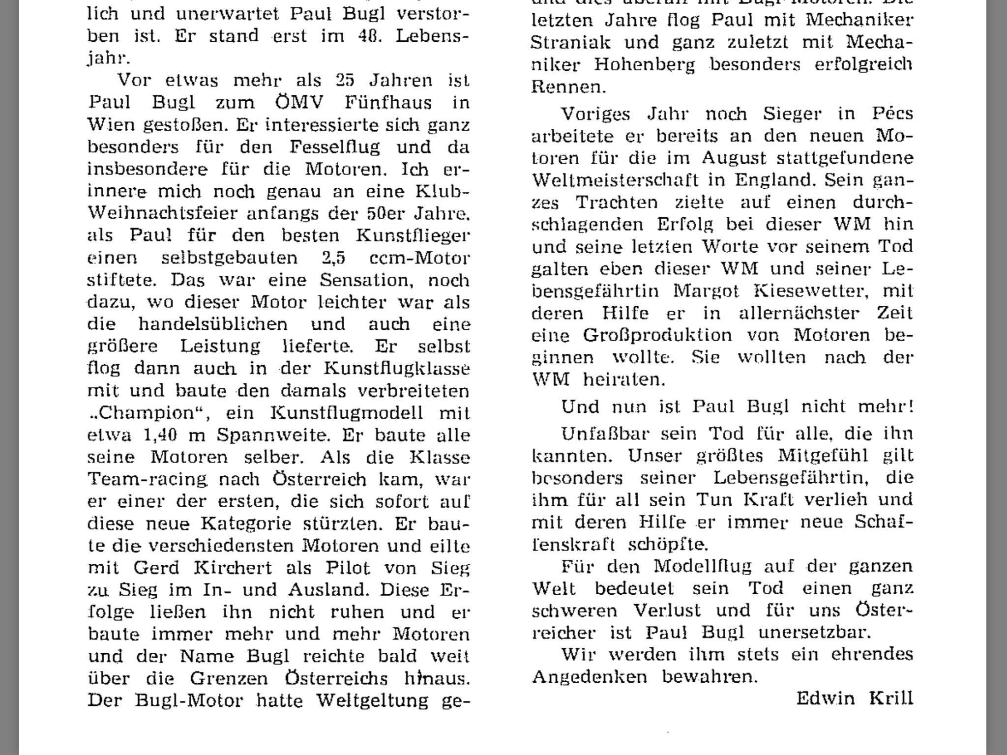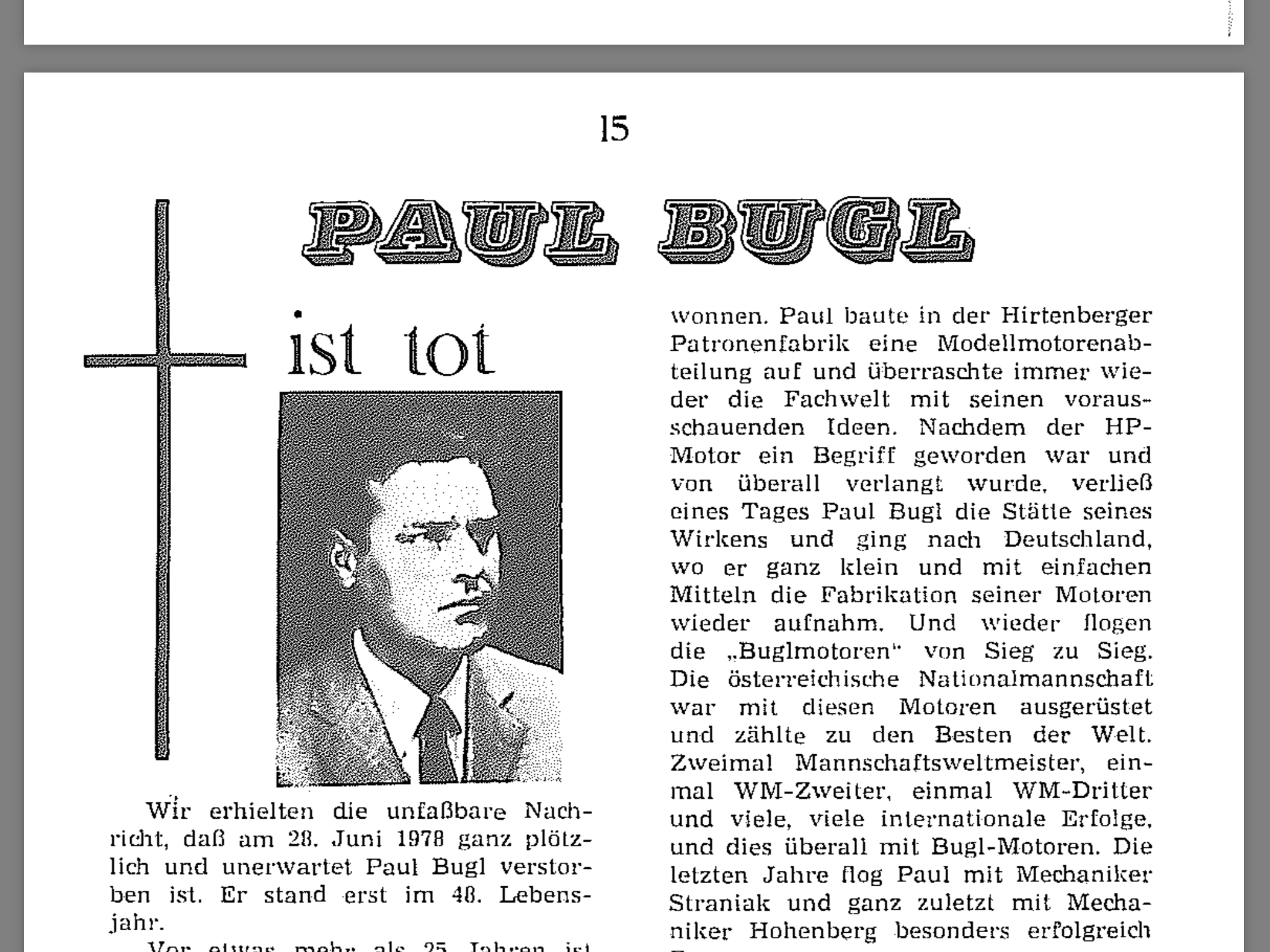 I have been asked by Luis Petersen if I would like to add a chapter to his history of Paul Bugl. These are my personal memories of my short acquaintance with Paul Bugl and the Bugl boys who flew his motors and the “MOSKITO” models.